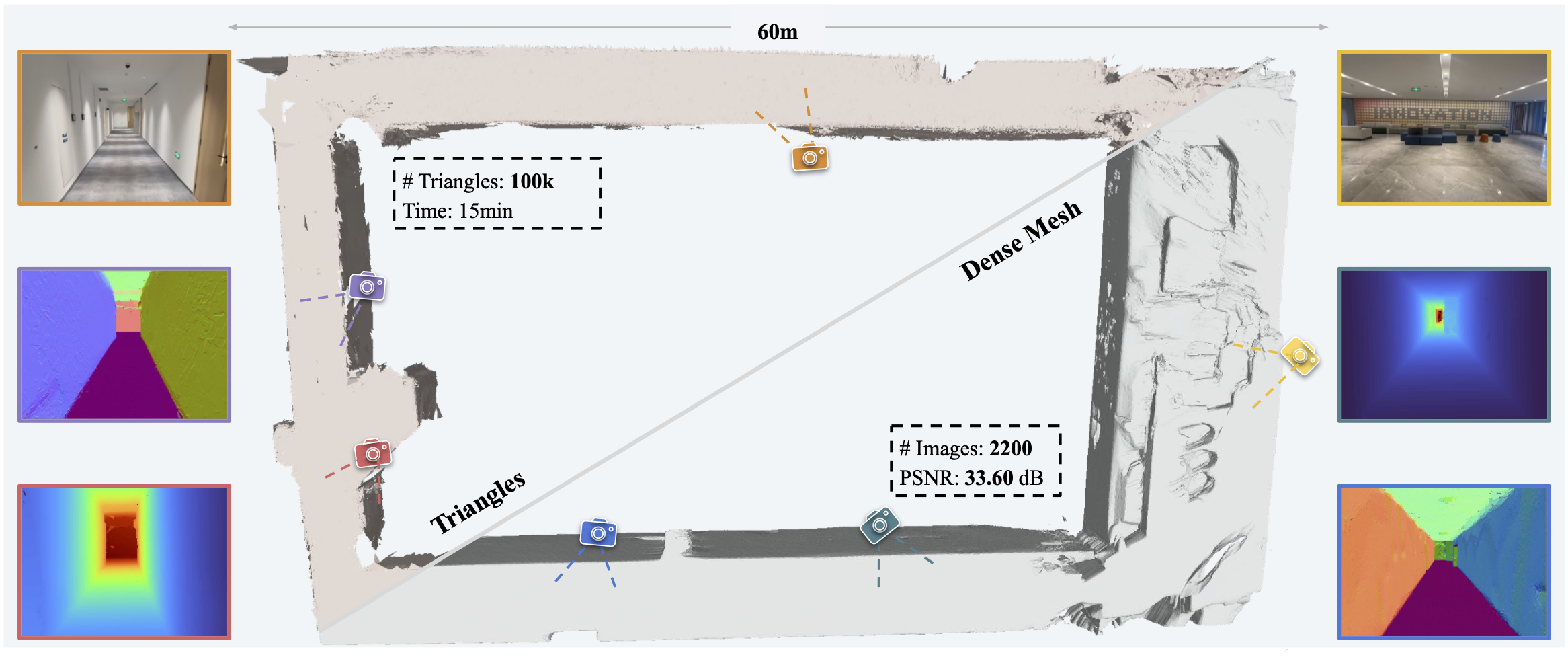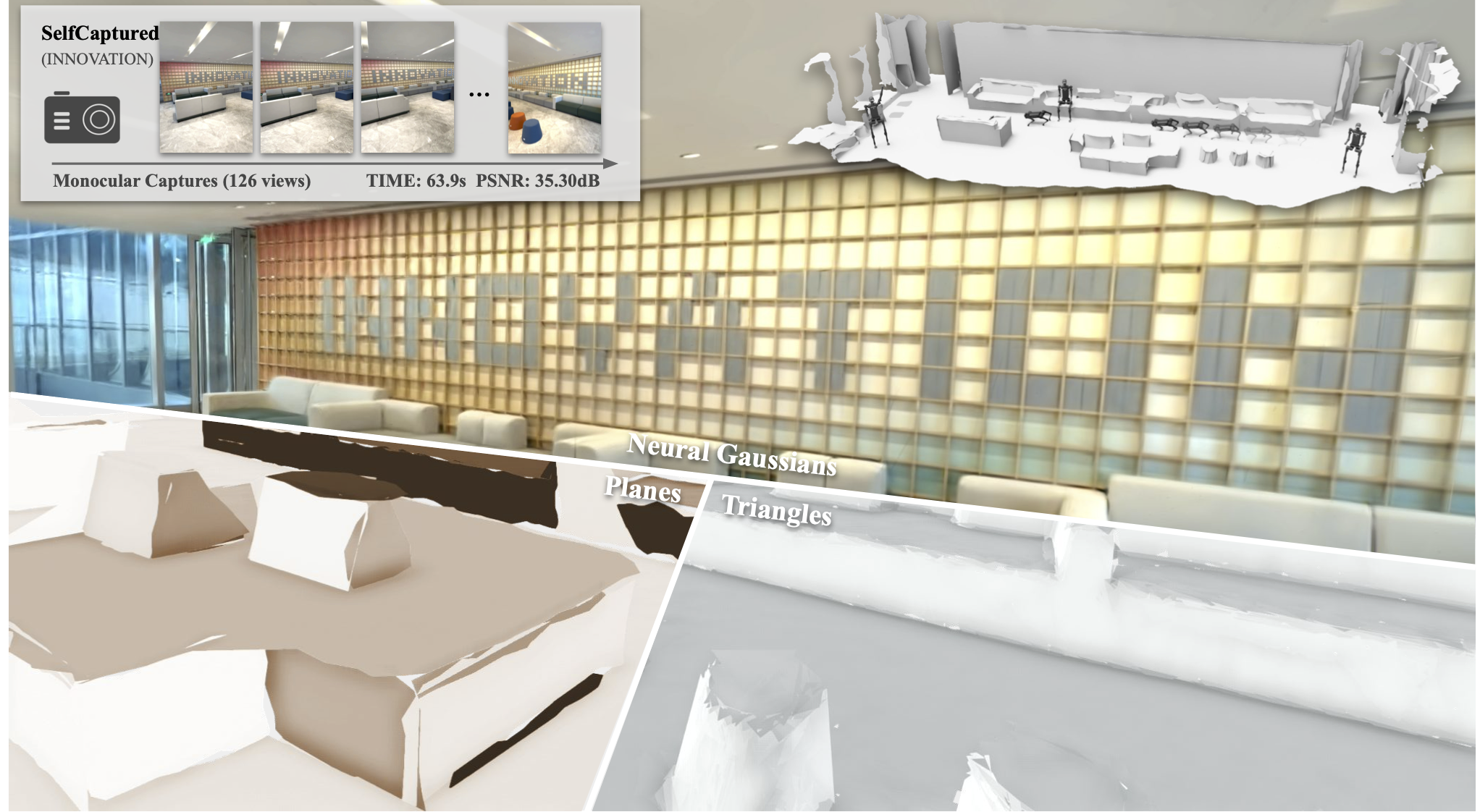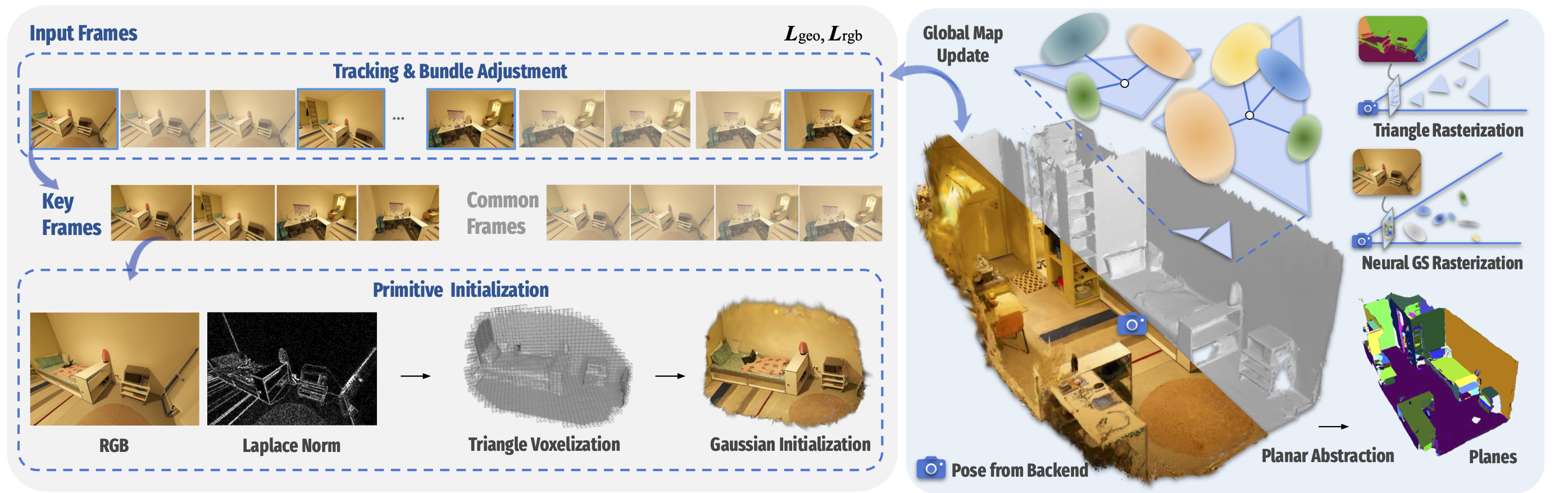 Pipeline of PLANING. PLANING adopts a hybrid representation in which triangles explicitly model scene geometry, while neural Gaussians decoded from these triangles render appearance. Built upon this representation, we develop a streaming reconstruction framework that takes unposed monocular image sequences as input and comprises a frontend for camera tracking, a backend for global pose optimization, and a mapper for scene reconstruction. Specifically, the mapper incorporates an efficient primitive initialization strategy to reduce redundancy. The recontructed triangle soup further enables efficient planar abstraction, facilitating a range of downstream tasks.