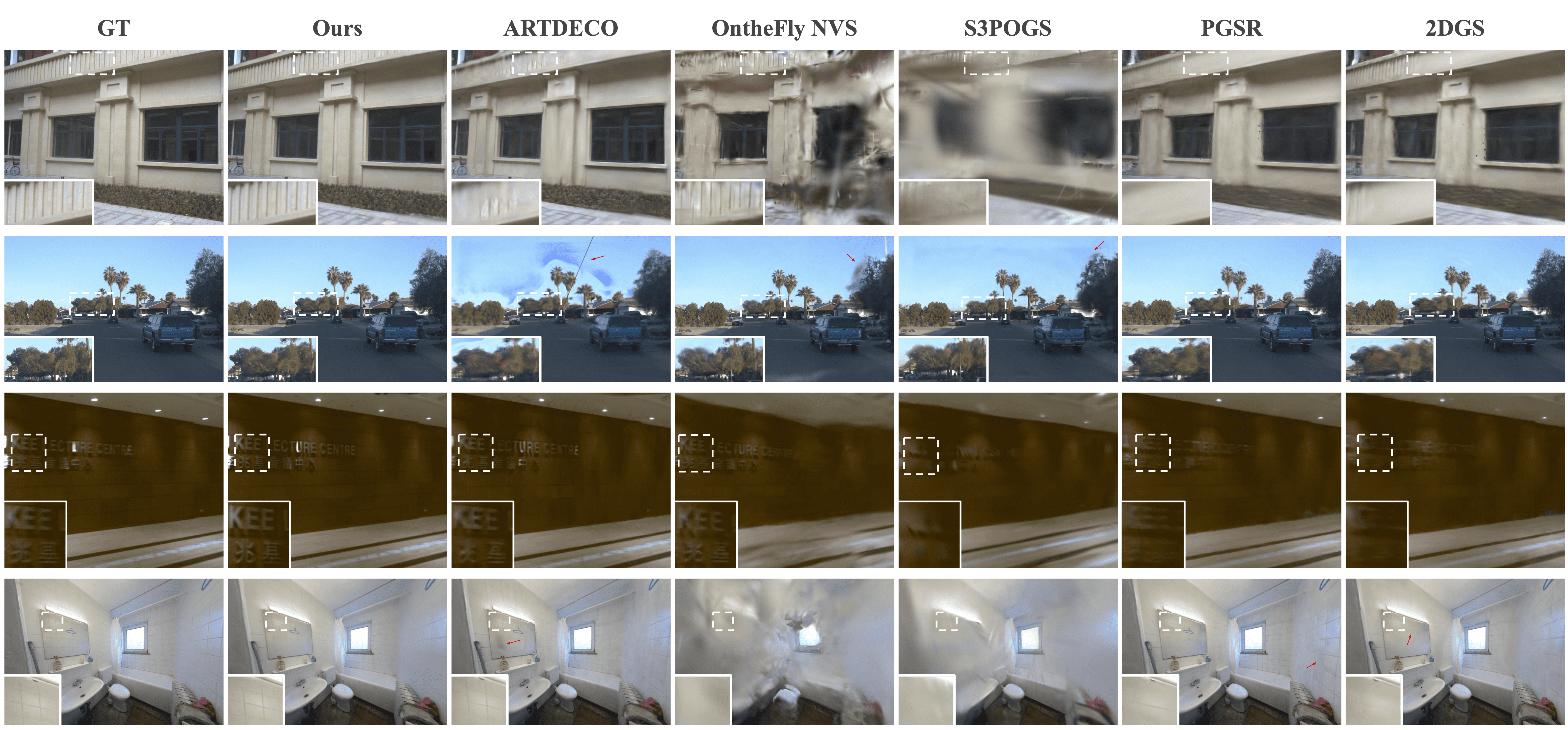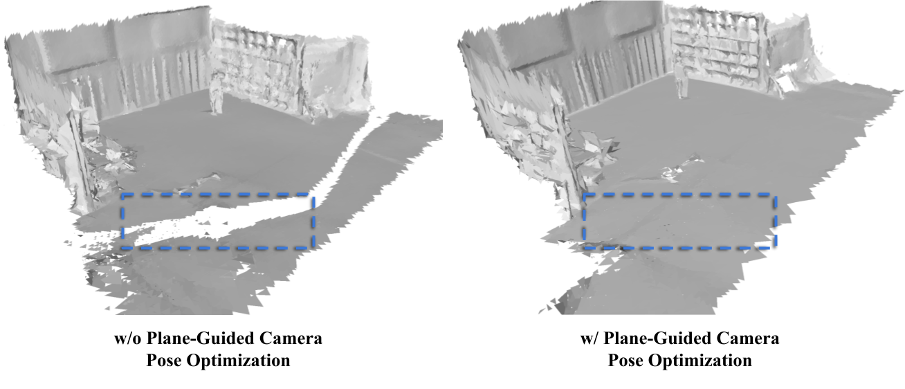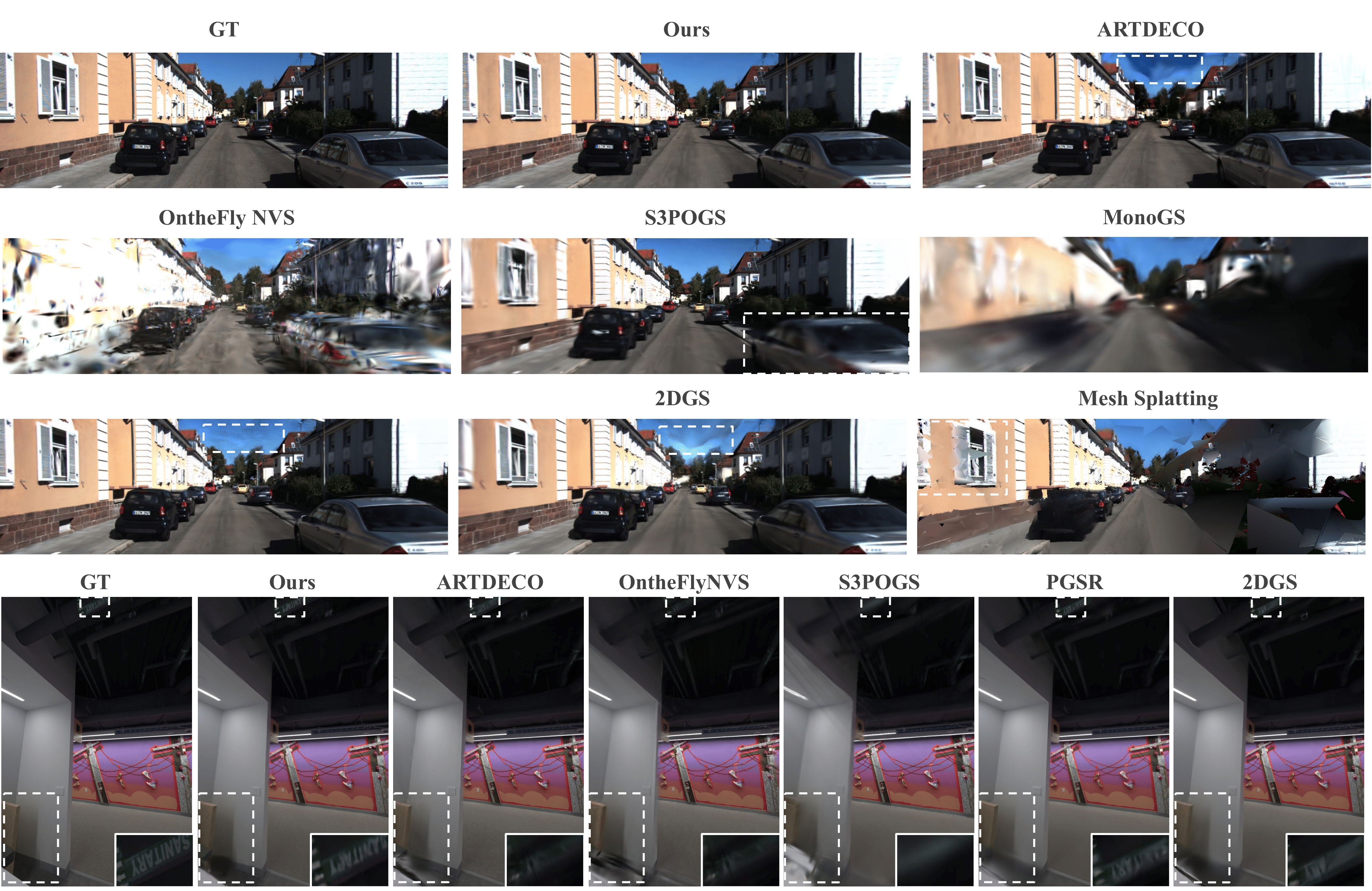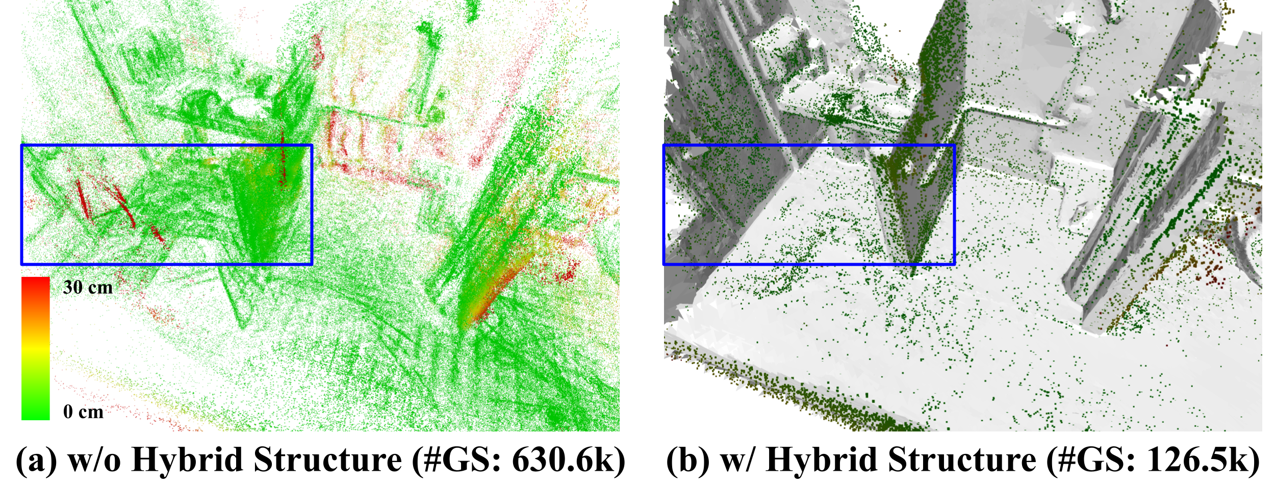 Pipeline of PLANING. PLANING adopts a hybrid representation in which triangles explicitly model scene geometry, while neural Gaussians decoded from these triangles render appearance. Built upon this representation, we develop a streaming reconstruction framework that takes unposed monocular image sequences as input and comprises a frontend for camera tracking, a backend for global pose optimization, and a mapper for scene reconstruction. Specifically, the mapper incorporates an efficient primitive initialization strategy to reduce redundancy. The recontructed triangle soup further enables efficient planar abstraction, facilitating a range of downstream tasks.