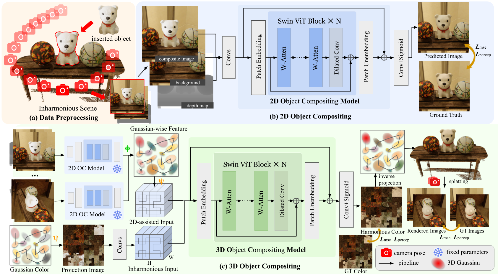 Overview of MV-CoLight. (a) We insert a white puppy as the composite object onto the table between basketballs, and render multi-view inharmonious images, background-only images, and depth maps using a camera trajectory moving from distant to close-up positions. (b) We input a single-view data into the 2D object compositing model, which processes the data through multiple Swin Transformer blocks to output the harmonized result. (c) We project the multi-view features from 2D models into Gaussian space via \(\Phi(\cdot)\), combine them with the original inharmonious Gaussian colors projected into 2D Gaussian color space through \(\Psi(\cdot)\), and then feed them into the 3D object compositing model. The model outputs harmonized Gaussian colors and computes rendering loss by incorporating Gaussian shape attributes.